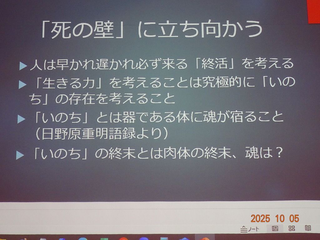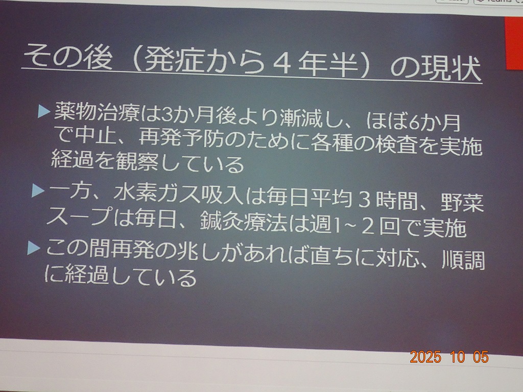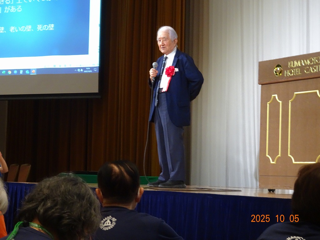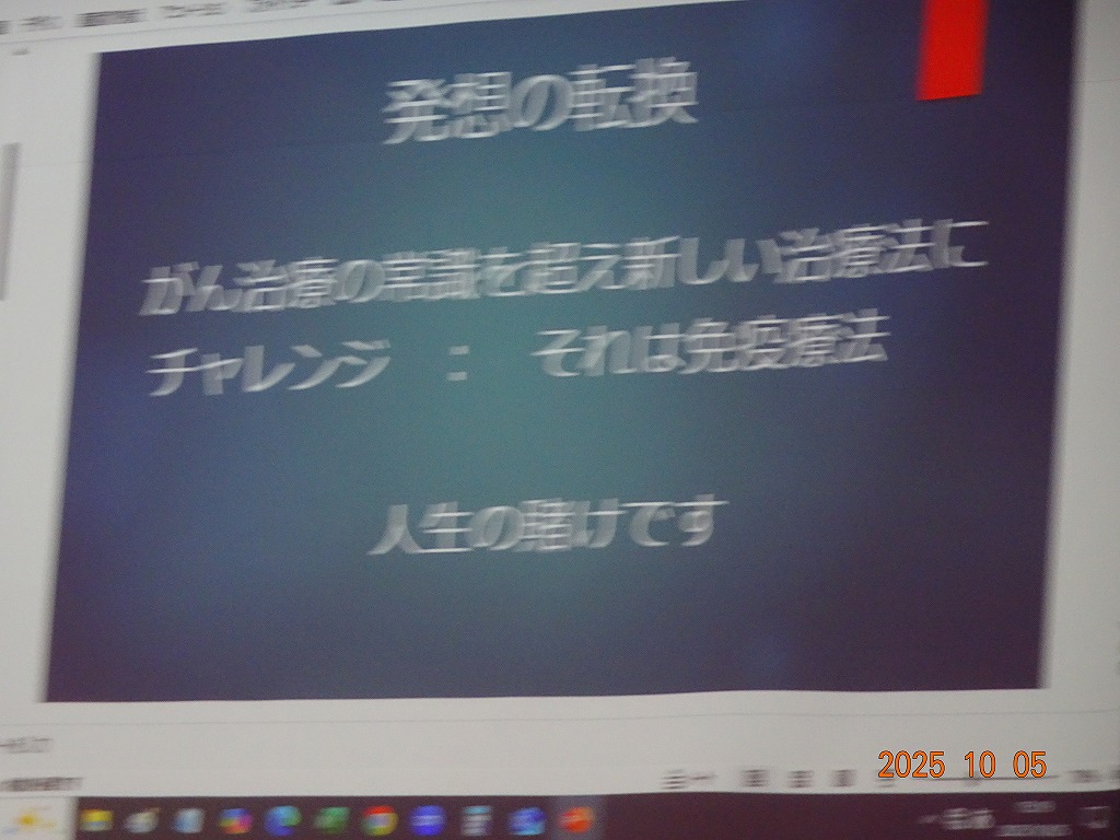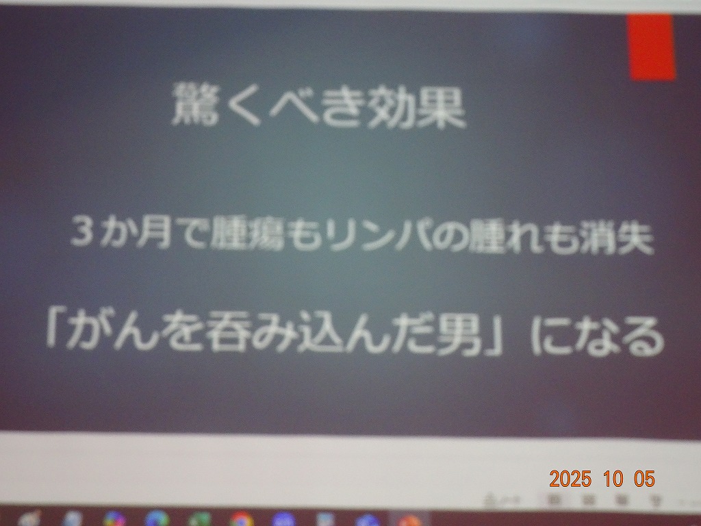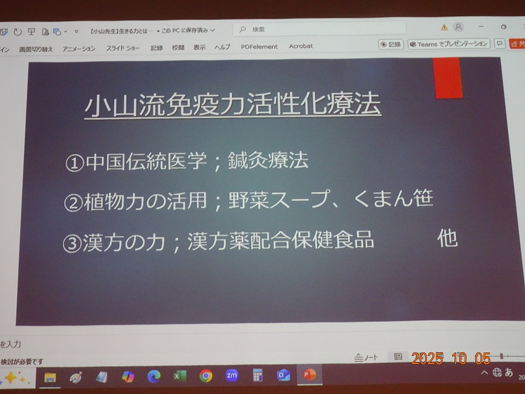 ○「第50回真向法研修全国大会参加ーin熊本ホテルキャッスル」の続きで、この大会でも目玉ともいうべき「生きる力」との演題での日本赤十字社熊本健康管理センター名誉所長小山和作先生(咽頭がん発症時88歳、現在93歳)の特別講演を、講演レジメ写真を掲載して紹介します。先生は、その凜とした姿勢と明瞭なな話しぶりで、到底、93歳とは思えません。 1.「がんを呑み込んだ男」小山和作先生からのメッセージの始まり、それは、青天の霹靂「周辺のリンパにも転移しているステージ4の咽頭がん」の発覚で 命の危険で直ちに入院手術の告知! 手術により声帯と食道の一部を失い、寝たきりになるおそれ→1週間の猶予を懇願 ![]() ![]() ![]() ![]() ![]() 2.発想を転換し、がん治療の常識を越えた免疫療法に人生を賭ける、その発想の基は農業の土づくりすなわちがんに打ち克つ免疫づくり。赤木純児医師の免疫統合医療を受診し 赤木メソッドと小山流免疫力活性化療法を始める ![]() ![]() ![]() ![]() ![]() 3.驚くべき効果!3ヶ月で腫瘍もリンパの腫れも消失し「がんを呑み込んだ男」になる。がん治療の経過写真から明らか、治療(クリニック)と検査・経過観察(総合病院・専門病院)のSOFTな連係プレーすなわち医療における新しい連携システムが功を奏し、6ヶ月で薬物治療を中止し、その後は経過観察、発症から4年半も順調に経過 ![]() ![]() ![]() ![]() ![]() 4.「生きる力」とは、「いのち」ある限り生きたいという生物の本能。「生きる」上で「病」、「老い」、「死」という3つの壁がある。「病の壁」に立ち向かうには、先ずがん・血管病の予防と免疫力をたかめ、先進医療を活用すること、但し、本当の主治医は人生を営む自分 ![]() ![]() ![]() ![]() ![]() 5.「老いの壁」に立ち向かうのは ①食事:最強の野菜スープの勧め、②腸活:快食・快便・快眠、③身体機能維持:速歩・握力等体力と平衡感覚・視力聴力・体温、④精神機能の賦活:楽観的思考・人生の目標使命感が生きる力となる。「死の壁」に立ち向かうのは 「いのち」とは器である体に魂が宿ることと考え、器の体が終末となっても魂は残り、魂は「気」であり、「気」は157億歳で老化はしないと考えるべき? ![]() ![]() ![]() ![]() ![]() 以上:892文字