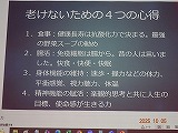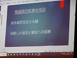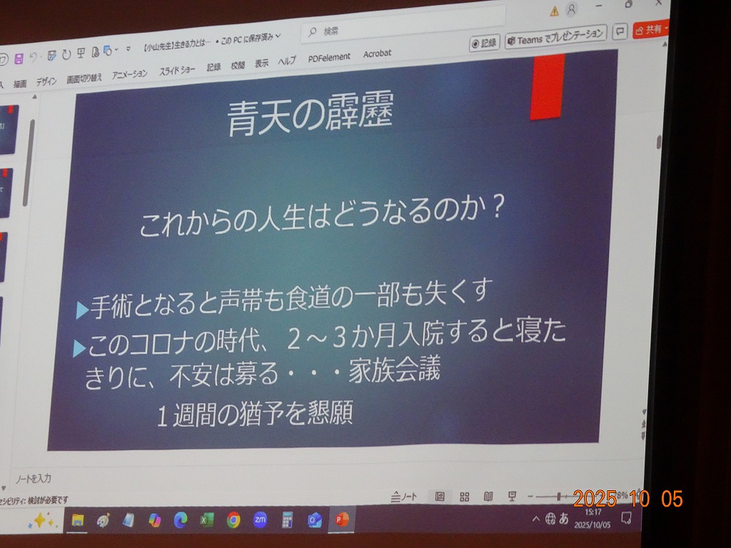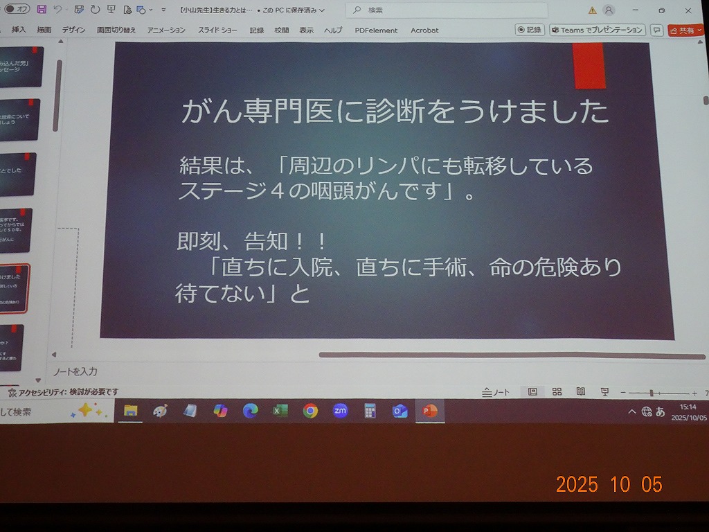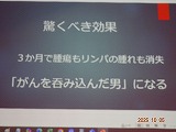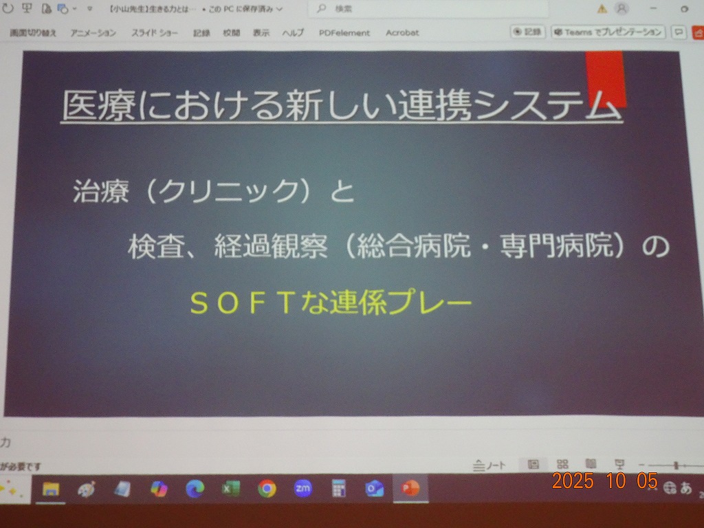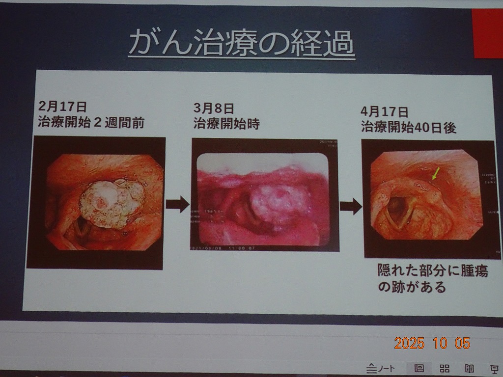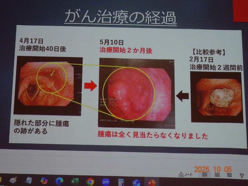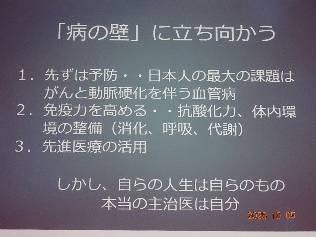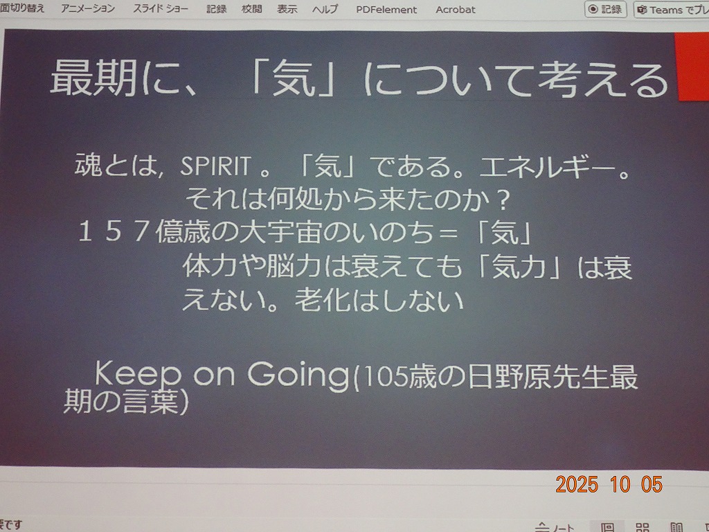 ○「第50回真向法研修全国大会参加ーin熊本ホテルキャッスル」の続きで、この大会でも目玉ともいうべき「生きる力」との演題での日本赤十字社熊本健康管理センター名誉所長小山和作先生(咽頭がん発症時88歳、現在93歳)の特別講演を、講演レジメ写真を掲載して紹介します。先生は、その凜とした姿勢と明瞭なな話しぶりで、到底、93歳とは思えません。 1.「がんを呑み込んだ男」小山和作先生からのメッセージの始まり、それは、青天の霹靂「周辺のリンパにも転移しているステージ4の咽頭がん」の発覚で 命の危険で直ちに入院手術の告知! 手術により声帯と食道の一部を失い、寝たきりになるおそれ→1週間の猶予を懇願 ![]() ![]() ![]() ![]() ![]() 2.発想を転換し、がん治療の常識を越えた免疫療法に人生を賭ける、その発想の基は農業の土づくりすなわちがんに打ち克つ免疫づくり。赤木純児医師の免疫統合医療を受診し 赤木メソッドと小山流免疫力活性化療法を始める ![]() ![]() ![]() ![]() ![]() 3.驚くべき効果!3ヶ月で腫瘍もリンパの腫れも消失し「がんを呑み込んだ男」になる。がん治療の経過写真から明らか、治療(クリニック)と検査・経過観察(総合病院・専門病院)のSOFTな連係プレーすなわち医療における新しい連携システムが功を奏し、6ヶ月で薬物治療を中止し、その後は経過観察、発症から4年半も順調に経過 ![]() ![]() ![]() ![]() ![]() 4.「生きる力」とは、「いのち」ある限り生きたいという生物の本能。「生きる」上で「病」、「老い」、「死」という3つの壁がある。「病の壁」に立ち向かうには、先ずがん・血管病の予防と免疫力をたかめ、先進医療を活用すること、但し、本当の主治医は人生を営む自分 ![]() ![]() ![]() ![]() ![]() 5.「老いの壁」に立ち向かうのは ①食事:最強の野菜スープの勧め、②腸活:快食・快便・快眠、③身体機能維持:速歩・握力等体力と平衡感覚・視力聴力・体温、④精神機能の賦活:楽観的思考・人生の目標使命感が生きる力となる。「死の壁」に立ち向かうのは 「いのち」とは器である体に魂が宿ることと考え、器の体が終末となっても魂は残り、魂は「気」であり、「気」は157億歳で老化はしないと考えるべき? ![]() ![]() ![]() ![]() ![]() 以上:892文字
