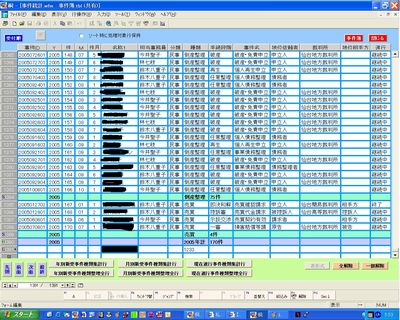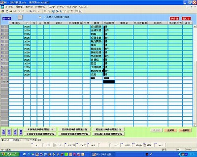 ○久しぶりに桐の話題です。 平成12年8月、lc-netという弁護士仲間MLでの発言をきっかけに同年12月5日開催日弁連コンピュータ委員会主催コンピュータフェアに当事務所の桐法律事務システムを展示・発表していただけることになました。 ○そこで何か目玉が必要と感じて顧客簿、事件簿にIDを取り入れることにして、これまでバラバラだった各tblファイルに共通の顧客ID項目を設けてリレーショナル化すべくtblファイル、wfmファイル等の整理を始め、リレーショナルによる文書作成効率化の一端を披露して、同年12月のコンピュータフェアで好評を博しました。 ○これに気をよくして顧客IDを顧客IDと事件IDに分けて管理するようになりこれが大正解で現在の当事務所のファイルには全てに顧客ID、事件IDを設けてこのIDによるリレーショナル化を強化して、「一度入力したデータは二度と入力しない」を相当程度実現しています。 ○中心ファイルは事件簿ですが、この事件について統計が簡単に取れるように以下の事件簿統計フォームを作っております。 統計を取ってどうするのよ、と聞かれると答えに窮するのですが、自分が現在取り扱っている事件や過去に取り扱った事件の種類・件数を正確に把握できて何となく気分がよいと言うだけで、これ又自己満足の道楽に過ぎませんね(^^;)。 ・事件簿統計フォーム基本 ・現在継続中事件の事件種類毎表示集計行 ![]() ・現在継続中事件の事件種類毎表示全行 ![]() ・各年受任事件数事件種類毎表示集計行 ![]() ・各年受任事件数事件種類毎表示全行