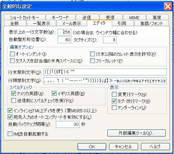 ○どのソフトでもそうですが、きめ細かな設定が出来るようになっており、Becky!の場合は、ツールの全般的な設定で「全般」から「高度」まで12個のタブで細かい設定が出来るようになっています。しかし、私の場合、桐以外のソフトは細かく探求する気にならず、殆どデフォルト(初期設定)のままで使用していました。