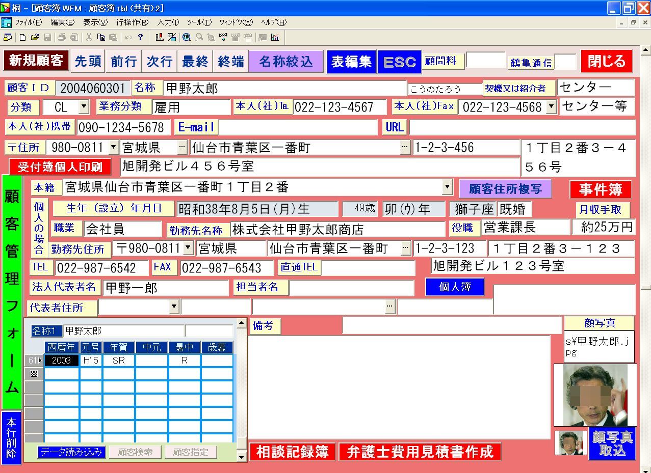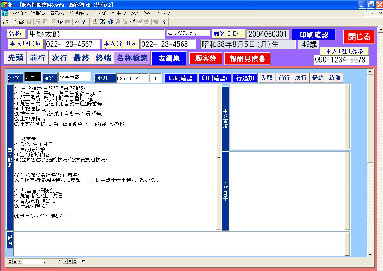 ○「平成25年の目標整理概観等」の○桐関連3.顧客簿・相談受付簿の充実化に「更に相談受付簿も相談種類毎の定型聞き取りデータを瞬時に入力して入力の省力化・合理化を図ります。」と記載していました。早速、その相談種類毎の定型聞き取りデータを瞬時に入力システムをモーダルフォーム呼び出し形式で作成中ですが、久しぶりの桐操作に基本を忘れており、なかなか、思い通り進まず、悪戦苦闘中です。 ○試行錯誤の結果、何とか、次のような流れでの定型聞き取りデータ瞬時入力システム付き相談簿が出来上がりました。 先ず顧客簿を開いて入力します。従前の顧客甲野太郎さんが交通事故の相談に来ました。 ![]() 次に相談簿を開いて分類項目に民事、種類項目に交通事故、相談日を入力します。 ![]() 次に大きくスペースを取った事案概要欄への入力になりますが、左端の入力支援ボタンをクリックすると、相談書式交通事故データの事案概要例が、細目として、症状固定前、後遺障害非該当、後遺障害該当、死亡の4つに分けて出てきます。甲野太郎さんは症状固定前だったので、これを「貼り付けコマンドボタン」をクリックして貼り付けます。 ![]() 次のように事案概要欄に聞き取りに必要なデータが入力されました。そこでこの聞き取りデータを元に相談されるお客様から、交通事故証明書・診断書等の必要な書類を頂き、所定データを入力します。この方式であれば、弁護士に限らず事務局員でも必要データの入力は可能です。このデータを見た上で弁護士が直接相談に当たれば、相談も合理的・省力的に短時間で可能になります。 ![]() ○相談書式.tblの表編集形式での表示は以下の通りです。 ![]() 交通事故の次には、種類男女問題として、細分類離婚、不貞、婚約破棄等に分けて事案概要聞き取りデータを入力していきます。更に相続家族、金銭貸借、賃貸借、売買、請負、土地境界等の事案概要入力のための聞き取りデータを入力して充実させます。この相談書式のデータも必要に応じて、追加・削除・訂正等加えて,より使い易いものにしていきます。これによって新人弁護士の相談も格段にやりやすくなり、且つ、相談事項、回答骨子も典型例を入力することにより、それを修正してその事案に具体的妥当な回答を文書化しやすくなるはずです。 これによって、相談結果を印刷文書にして相談終了後にお客様にお渡しする体制を強化します。 以上:967文字