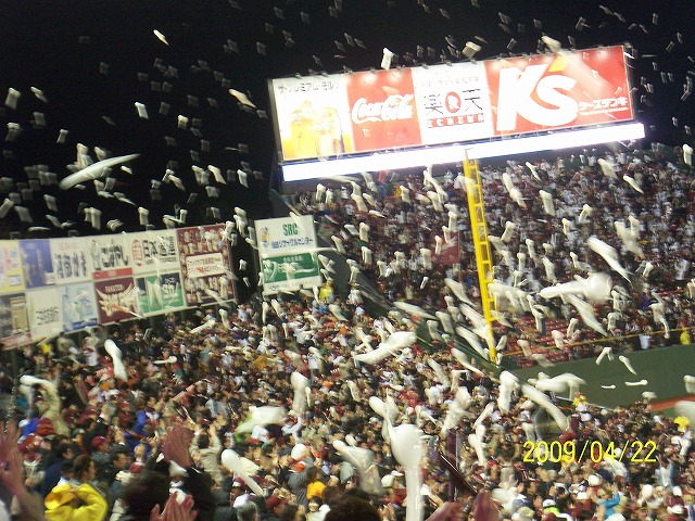 ○平成21年4月22日、いつもの顧問先のご招待でゴールドパッケージイーグルシート3塁側Aブロック26列41番の席で、私にとって平成21年初の楽天-千葉ロッテ戦ナイトゲームを観戦しました。平成20年もその顧問先から招待券贈呈を受けるも5,6月後雨で流れ、初観戦は「楽天-ソフトバンク戦平成20年初観戦も惜敗」記載の通り、7月でしたが、今年は楽天絶好調と言うことで早くも4月に招待券を贈呈頂きました。 ○天気予報では、22日までパッとしない天気で、昨年同様雨で流れるのではと心配しておりましたが、21日で雨が上がりました。21日登板予定のマー君の試合が雨で流れたため、私の今季初観戦からマー君先発を観戦する幸運に恵まれました。顧問先には心より感謝申し上げます。 ○試合開始15分前にはクリネックススタジアム宮城(Kスタ宮城)に到着しましたが、さすがにまだ開幕20日後の4月22日で肌寒いせいか観客は午後6時試合開始時には空席が目立ち、半分くらいの入りとの印象でした。 試合開始直前 選手入場 始球式 マー君マウンドへ 開始後30分 ○試合は,楽天マー君と千葉ロッテ渡辺俊の投手戦となり、5回までは殆ど見せ場もなく淡々と進行しました。が、6回表千葉ロッテの攻撃に、マー君、初のノーアウトランナーを出し、送りバントと四球で、ツーアウトながら1,3塁となったところでロッテ4番の井口登場、この試合最大のピンチを迎えました。○私は、イーグルスネストで紅茶を飲みながら観戦しましたが、井口、ファール打で粘ること,粘ること、一発3点ホームランが出るのではと,ハラハラのしどおしでしたが、13球目に井口のバットから快音が発せられ、ボールは大きく飛び上がり,万事休す。と、思いきや、センター鉄平がフェンスにぶつかりながら打球をキャッチし、ピンチを脱し、これで勝負が決まりました。 ![]() ○4月22日は、夜になると結構肌寒く、風も強くて、夏用の薄いジャンパーで出かけた私は、寒くてこのままでは風邪をひくのではと感じて、試合途中で厚手の楽天用ジャンパーでも買おうと楽天グッズ売店に探しに行きました。ところが目当てのジャンパーは1万6000円と高価で、もっと安いものはないかと探すと2000円の毛布があり、これを購入して、身にまとい観戦しました。さすがに寒さに備えた商品も準備しています。○6回のピンチを切り抜けたマー君、7回表先頭打者を四球で歩かせ,おやっと思わせるもその後、立ち直り、9回表ロッテの6番サブローを討ち取るまで危なげない投球が続き、完封し、平成21年初観戦初勝利の感激を味わいました。 マー君力投 勝利の白風船 勝利報告 お立ち台