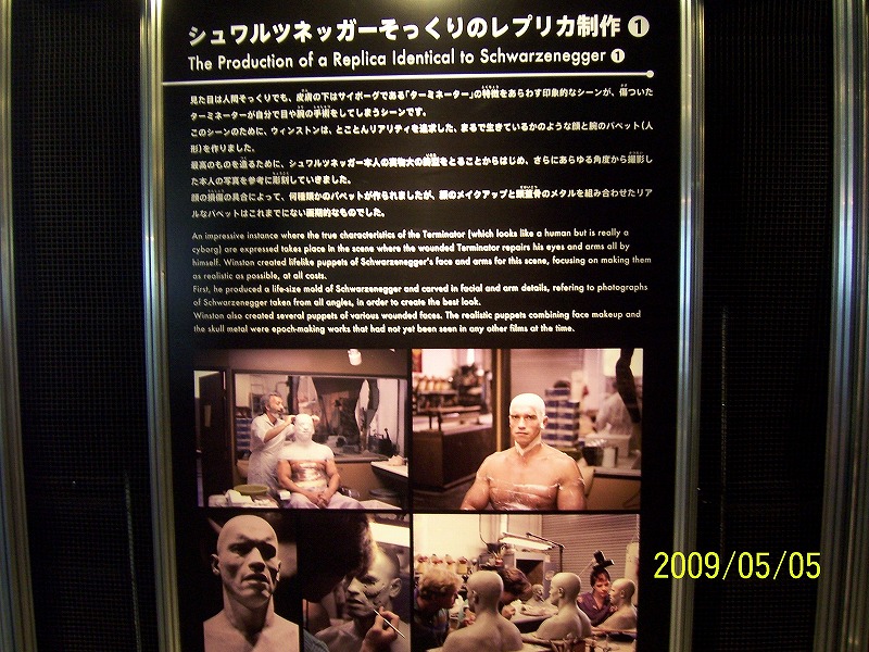 ○平成21年5月5日は、お台場の日本科学未来館でターミネーター展を観ました。午前11時30分頃行くと玄関から長蛇の列となっており、最後尾の札を持った職員に聞くと入館できるまでの時間は少なくとも1時間とのことで大阪USJの人気アトラクション並でした。 ○行列に並んで待つこと1時間10分程度経過したところで、ようやくエントランス直前まで来ると、身体障害手帳をお持ちの方はこちらへと案内されて行くと、何と、身体障害手帳写しを提示すると入場料1800円が無料サービスとのこと。おまけに障害者の付添人一人も無料で、結局高1の息子だけ学生割引チケット料金480円を支払い、大人2名は無料入館できました。身体障害者福祉の有り難みを実感し感謝した次第です(^^)。 ○ターミネーター展の他に企画展「お化け屋敷で科学する!― 恐怖の研究」をやっており、こちらから観ました。キャッチフレーズでは、「未来館のお化け屋敷で、恐怖しながら、恐怖について学び、考えてみませんか? お化けの助けを借りながら・・・」とあり、どんなに怖い目に遭わせて貰えるかと、胸躍らせて進行するも、全く怖さが伝わりません。ケチをつけて恐縮ですが、100人中99人は全く恐怖心を味わえなかったと思います。 ○これに対し「ターミネーター展 ~戦いか、共に生きるか? ロボットとボクらの未来~」の方は、豊富な資料が提示されており、結構楽しめました。以下、私のデジカメでの記録です。 ![]() ![]() ![]() ![]()