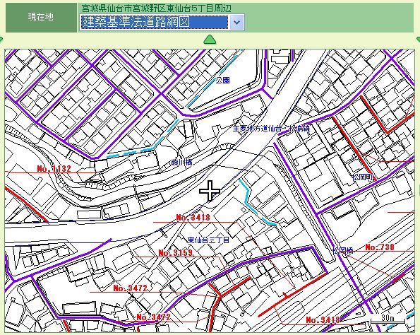 ○平成18年11月15日開催九士会で「建築と道路」担当小川土地家屋調査士から表記「仙台市都市計画情報インターネット提供サービス紹介」をご教示頂きました。この更新情報はどの分類、細分類い入れるべきか迷いましたが、不動産売買に関連するので分類「貸借売買」の細分類「売買等」に入れます。 ○この「仙台市都市計画情報インターネット提供サービス紹介」ですが、調査が必要な場所についての、以下に示す土地利用規制等に関する指定状況,並びに規制内容が一覧できるようになっています。 【提供する情報の内容】 (1)都市計画決定に関するもの □用途地域等の地域地区及び地区計画 □道路及び公園等の都市計画施設 □土地区画整理事業及び市街地再開発事業等の市街地開発事業 等 (2)都市計画以外に関するもの[現在デジタルデータ化されているものを提供] □環境保全区域・水質保全区域(広瀬川の清流を守る条例) □埋蔵文化財包蔵地(文化財保護法) □保存緑地(杜の都の環境をつくる条例) □駐車場周辺地区(建築物における駐車施設の附置及び管理に関する条例) □下水道処理区域 □建築協定 □建築基準法道路網図 □宅地造成工事規制区域(宅地造成等規制法)等 ○調査が必要な場所を選び、そこで情報検索をクリックすると下左図のように「用途地域」から「建築基準法道路網図」まで21種の規制内容が表示され、そこで「建築基準法道路網図」を選択すると、その場所の道路状況が表示され、その凡例は、下右図の通り、私道は紫線、2項道路等は青破線、位置指定道路は赤線、水平道路は緑線等で色分けして表示されます。 ○その結果、調べたい場所付近の道路状況が、市道(紫線)、位置指定道路(赤線)、2項道路(青破線)等で、下図のように表示されます。 昔は役所の窓口まで行って調査しなければならなかったことが、このようにネットに繋げるパソコンさえあればどこでも調査できるようになり、ホントに便利な時代になったものです。 以上:811文字